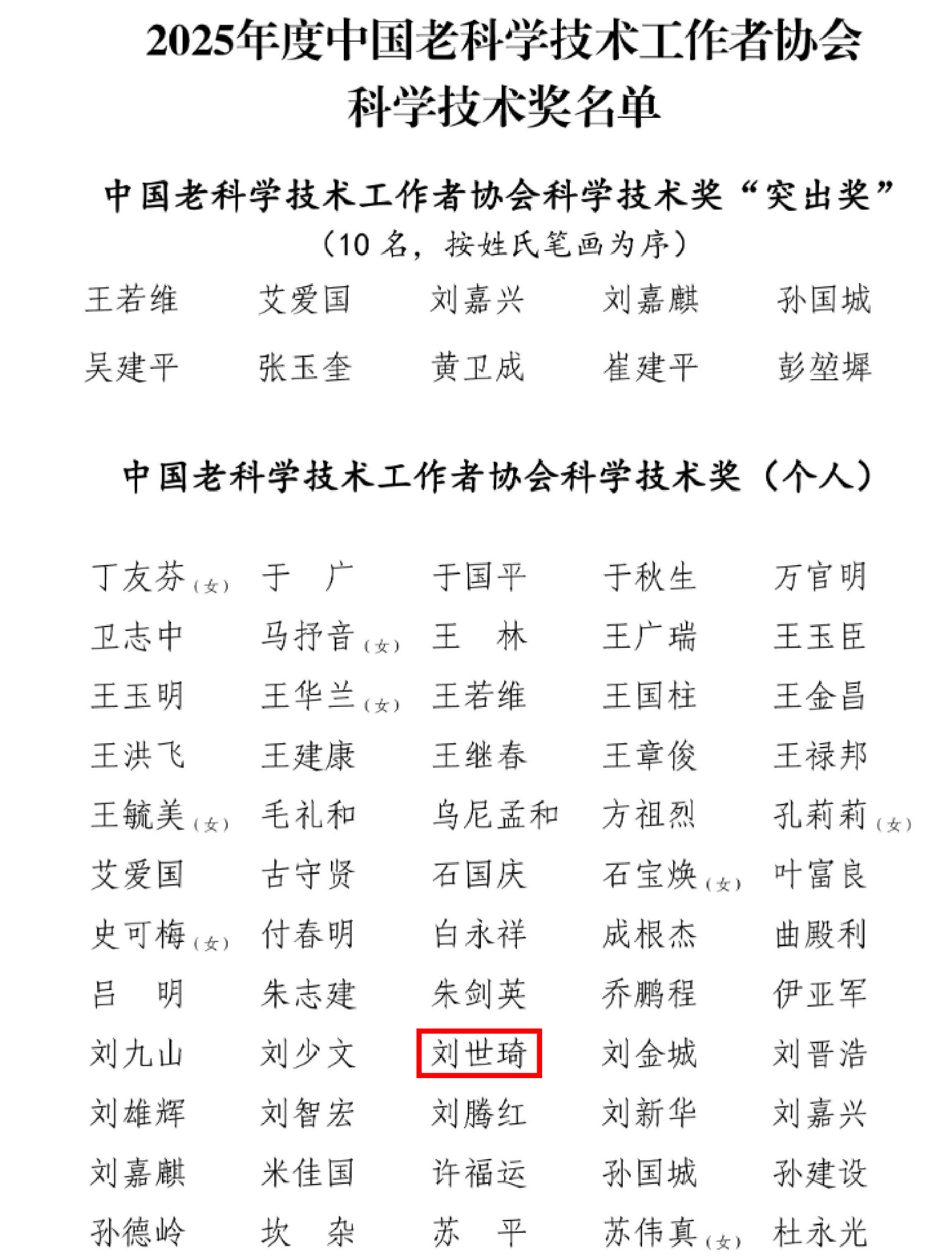 刘世琦教授荣获2025年度中国老科协科学技术奖